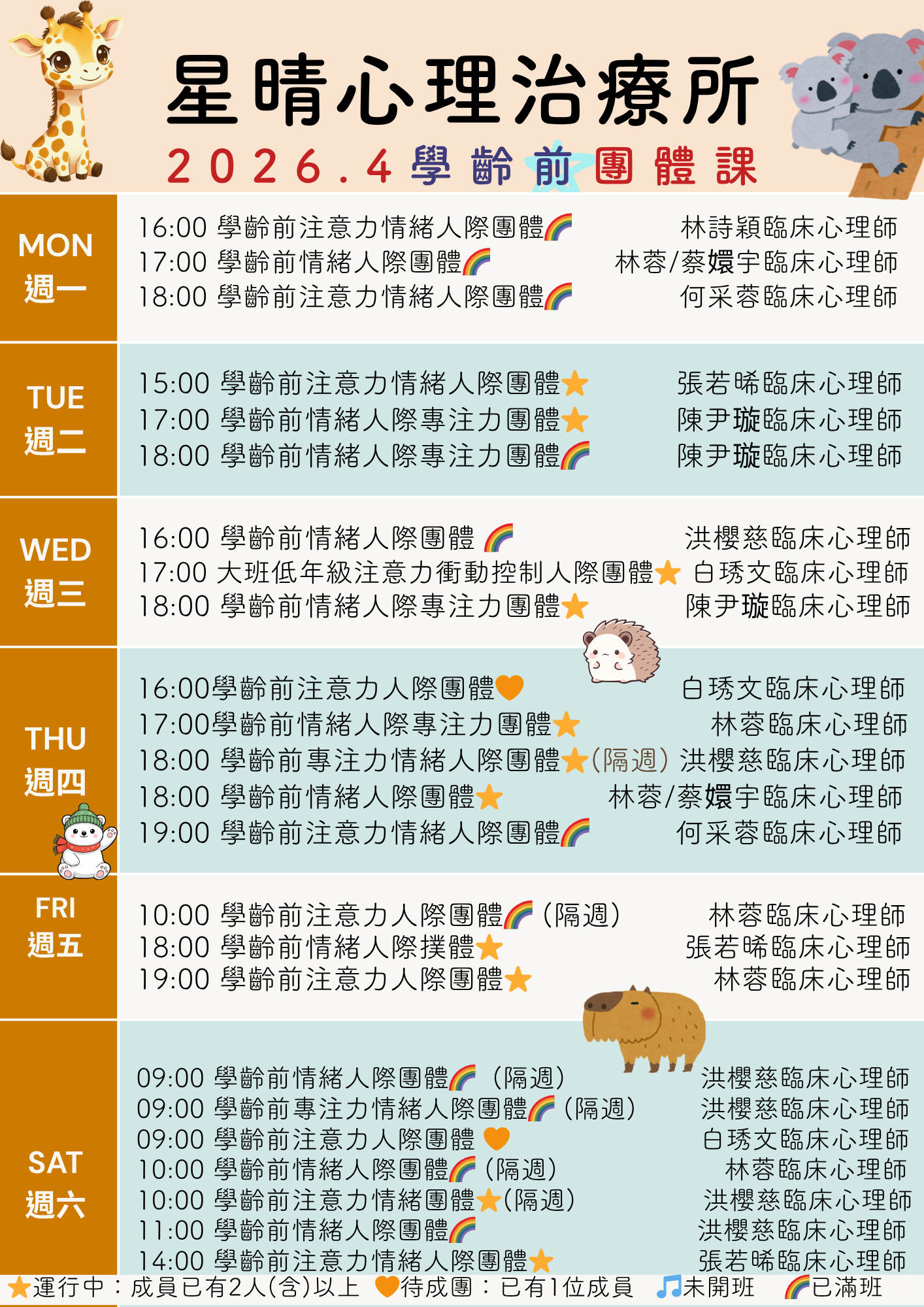 - 各類團體上課前,皆須在星晴進行初評(與孩子互動+親職會談),以利心理師了解孩子,與家長討論適合孩子的團體,以及制定個別化的治療目標。